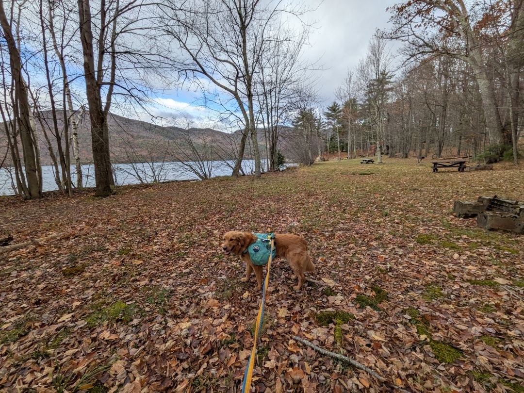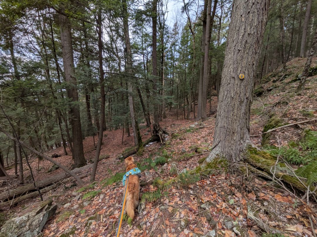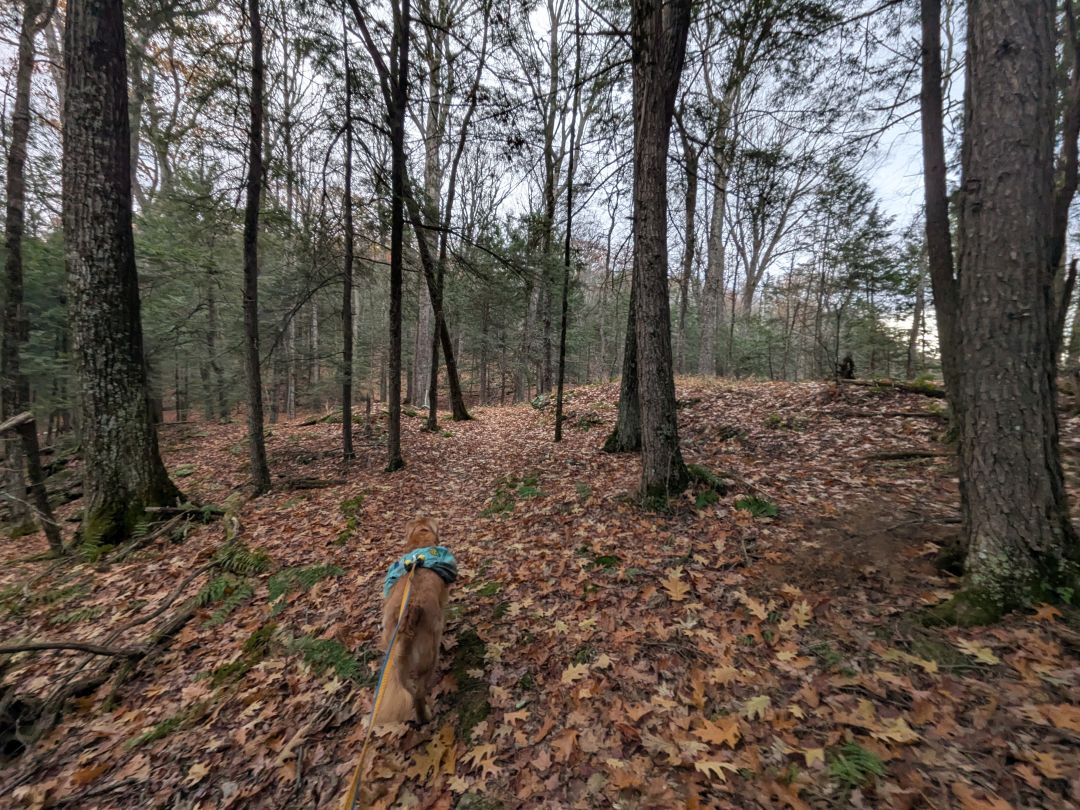 I hardly noticed the steady climb up Erebus's Southwestern spur. It was gentle and fun. The woods were very pretty despite it being brown season. Note that, during this hike, Sunny was only off-leash in the climbing wall area. We are in hunting season now and it's best if he stays tethered. He also wore double bells today, just to be on the safe side.
