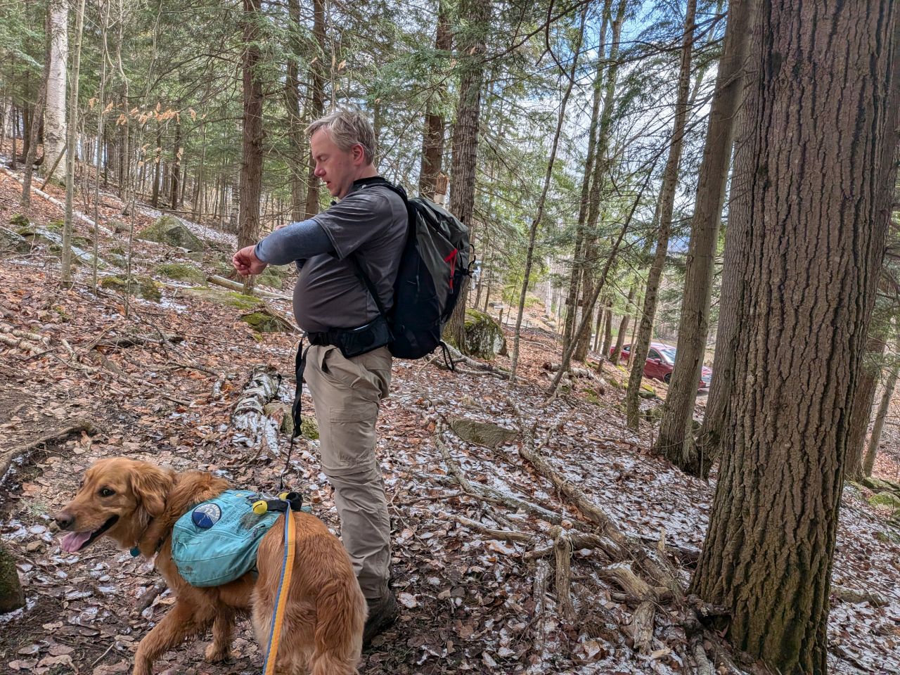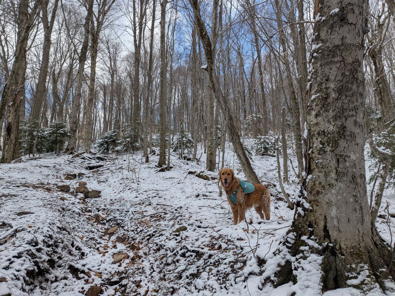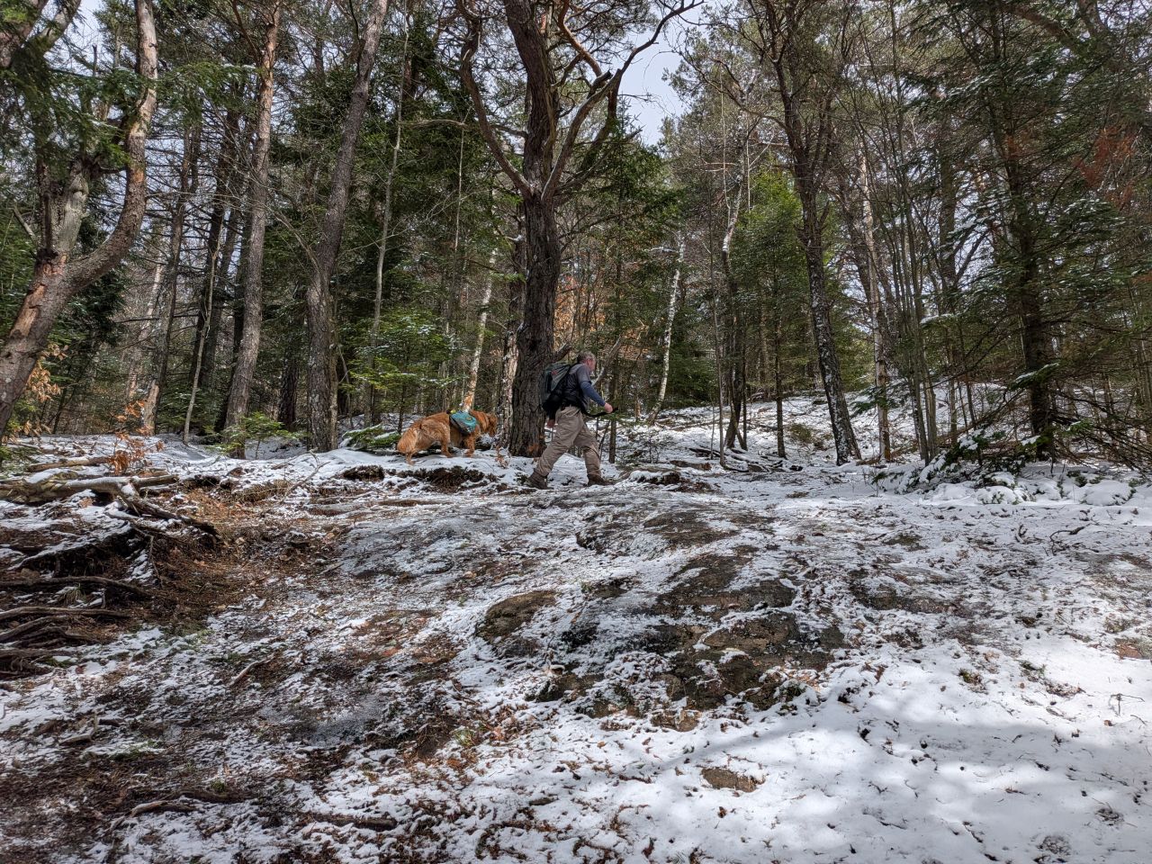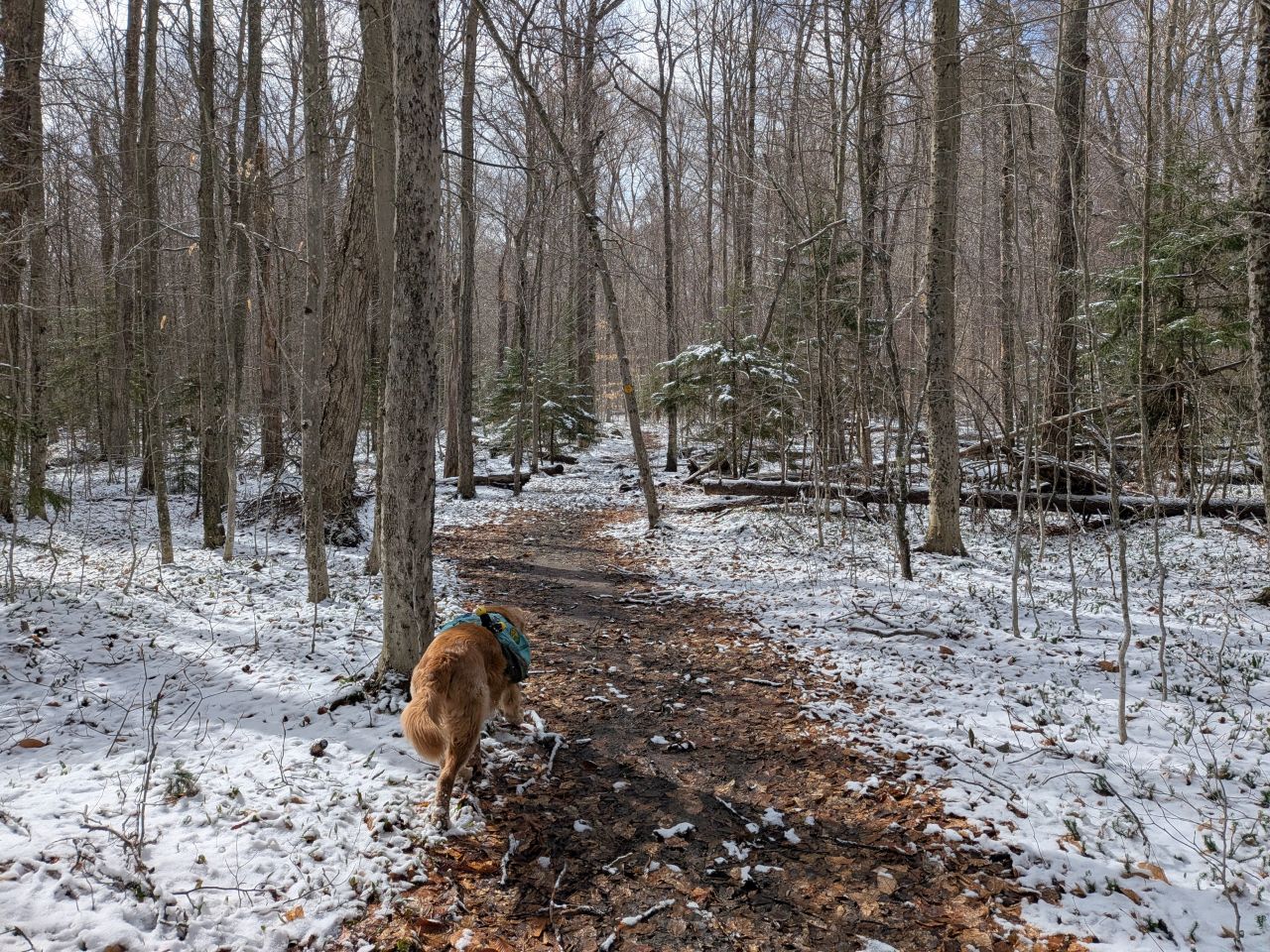 The terrain does a bit of up and down over the first lump of elevation. We saw no footprints in the snow despite there being a couple of cars in the lot. We figured those folks might have taken one of the other trails or were paddling rather than hiking. Dan suggested it might be okay to cut Sunny loose and I agreed. He was quite happy about this and frolicked merrily.