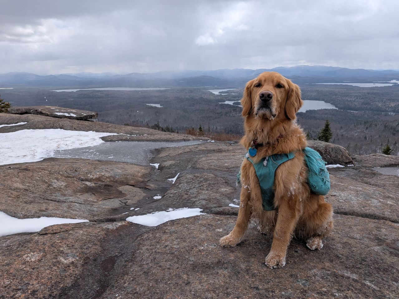 We ate our sandwiches and enjoyed the fire tower. It's always much easier to enjoy a fire tower with a friend there because someone can calm down Sunny while I climb it. The tower on Saint Regis isn't very tall, likely because it doesn't need to be in order to peek over the few trees up there. There's only stairs; no ladder.