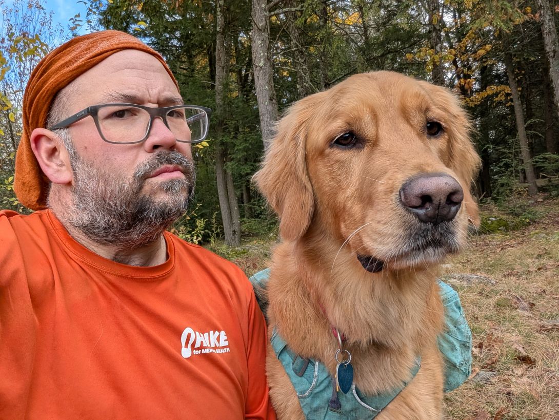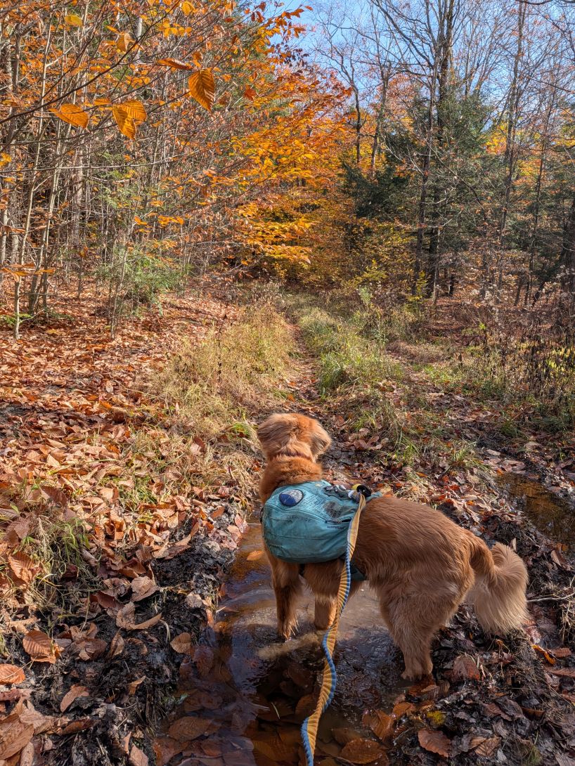 The hiking trails crisscross with old logging trails and the snowmobile trails. It's easy to wander onto one of these roads and have to either double back or bushwhack back to the real trail. It wasn't just me either. Several times Sunny tried taking the snowmobile trail or truck trail instead of sticking to the marked hiking trail. I wasn't sure if he was sniffing out the smell of vehicles, people, or animals, but it was a constant struggle for him.