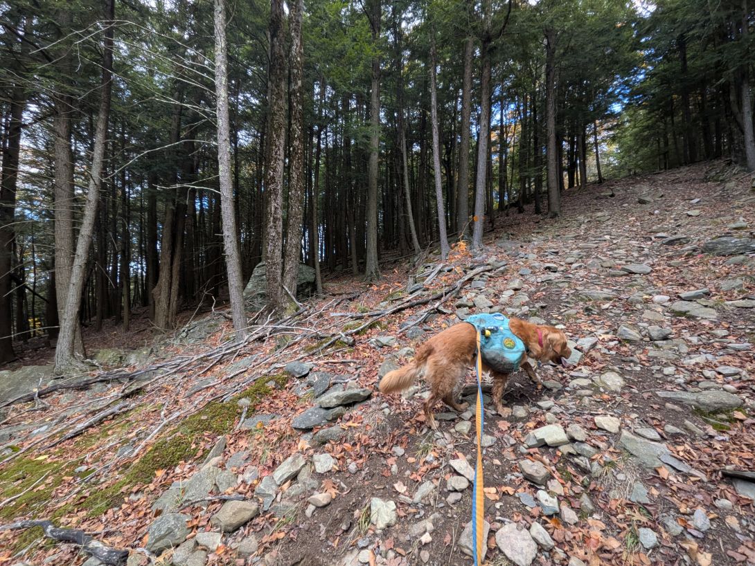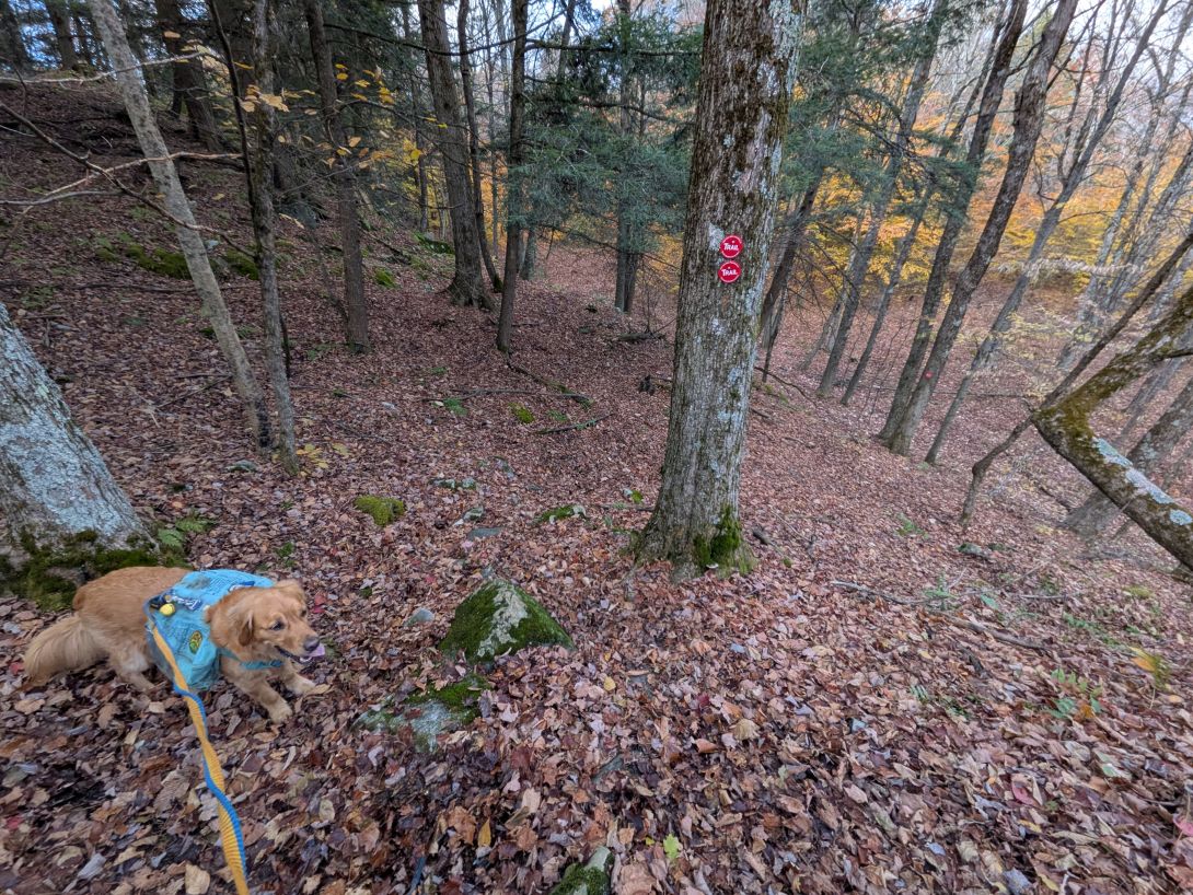 Views of the Tomhannock Resivoir are gorgeous up here. We enjoyed the cold breeze and the view for some time. Sunny was super alert because we spotted a solitary deer flit from cover to cover down below. The animal never actually fully showed itself in the truck trail, but we saw its tail in the shadows as it bounded away. It was big, dark, and alone, so I'd guess a layman's guess that it was a buck.
