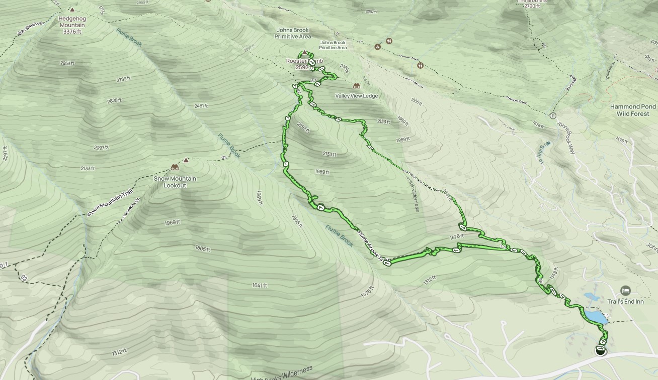 We chatted for a bit about what we'd be doing when an older gentleman showed up. He said taid that his group maintains the Rooster Comb trail exclusively and that the Rooster Comb trail was already cleared of any blowdown, but did need its drainages cleared. After some discussion, the trainer said we'd go up Flume Brook Trail instead, clearing blowdown on the way up, clear drainages on Rooster Comb trail on the way down.