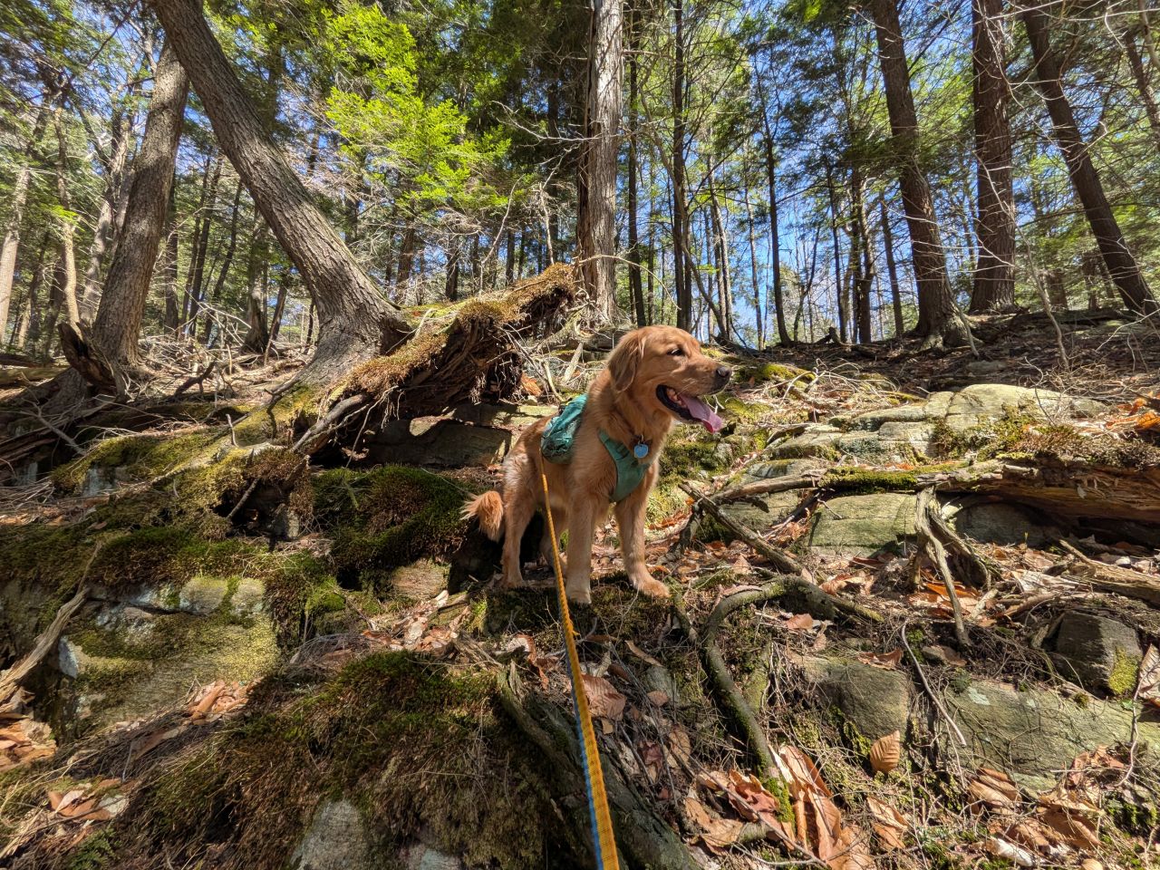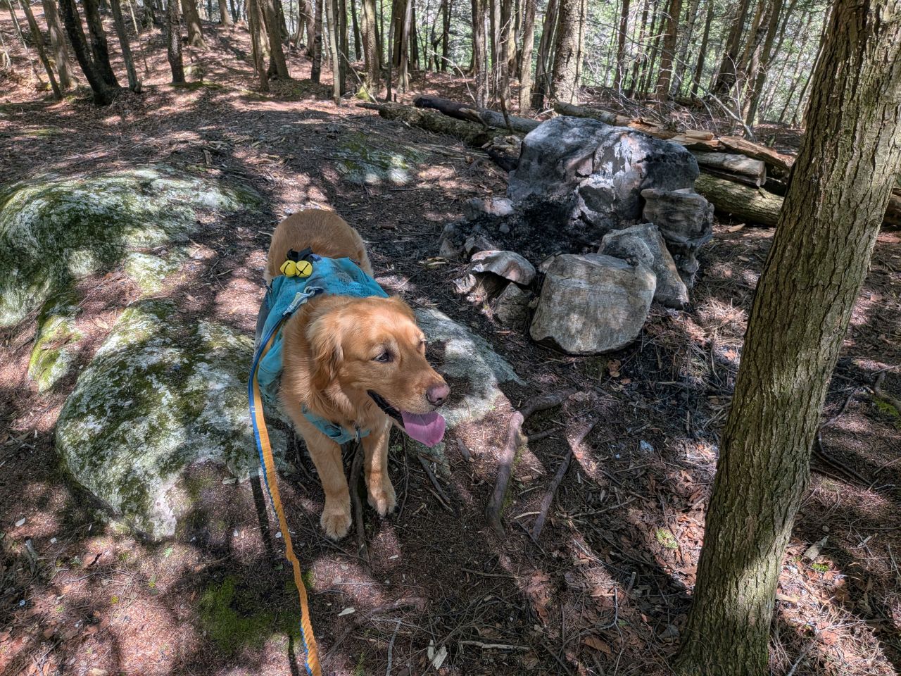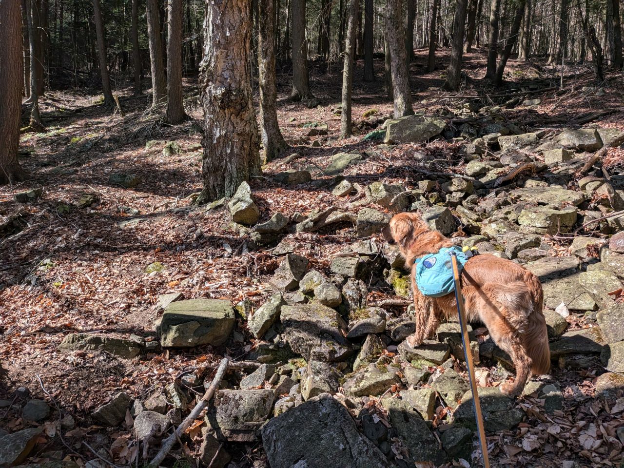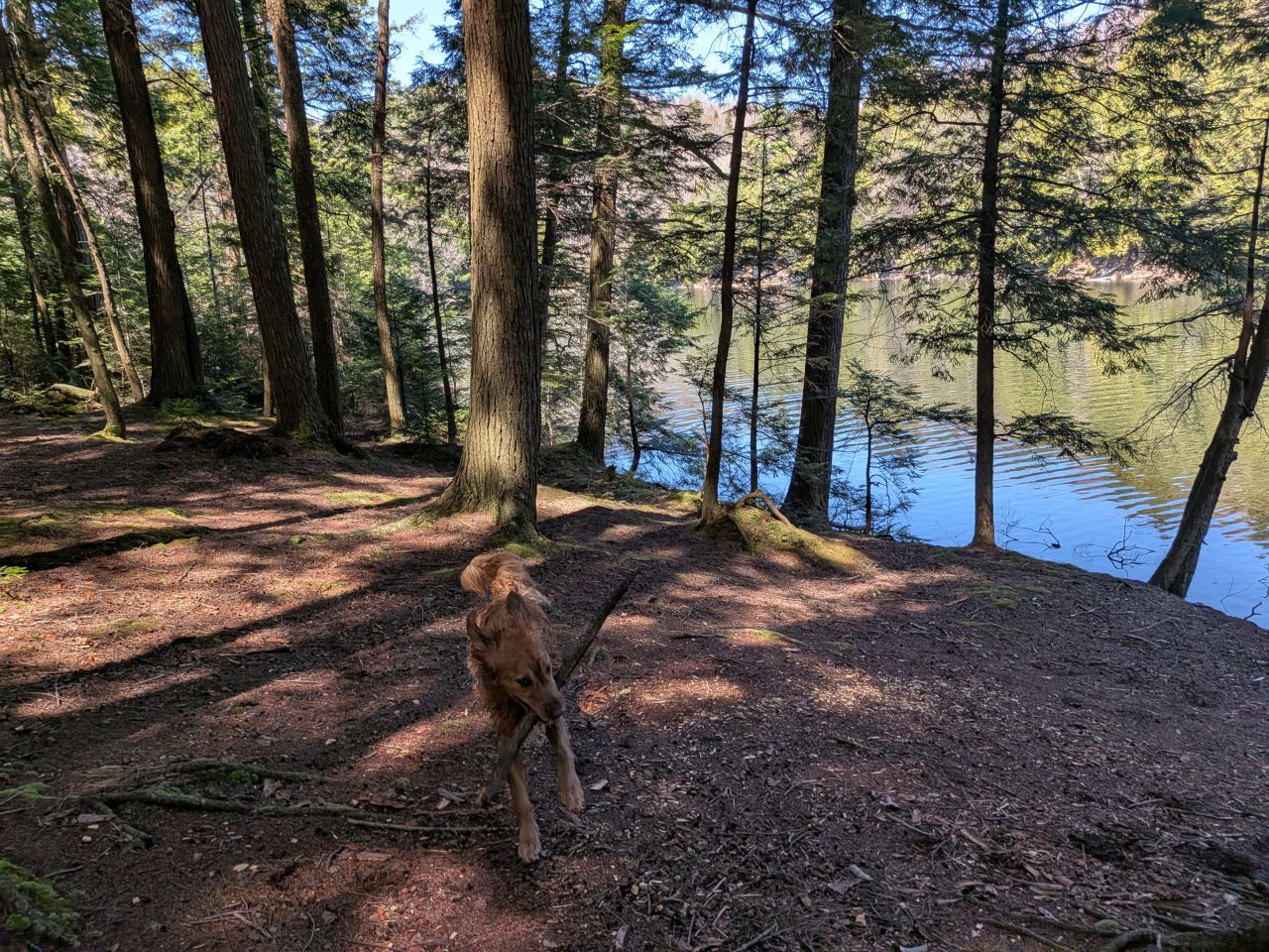 The sights along the way were pretty standard Lake George fare. Rocky streams cut across our path a few times which Sunny took advantage of. Rocky outcroppings slashed across the landscape past the trees on both sides. Although the deciduous trees had not yet decided to bloom much, the birds were singing (especially Jays). Hard-working woodpeckers were a constant companion today.