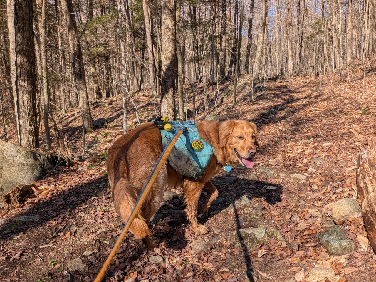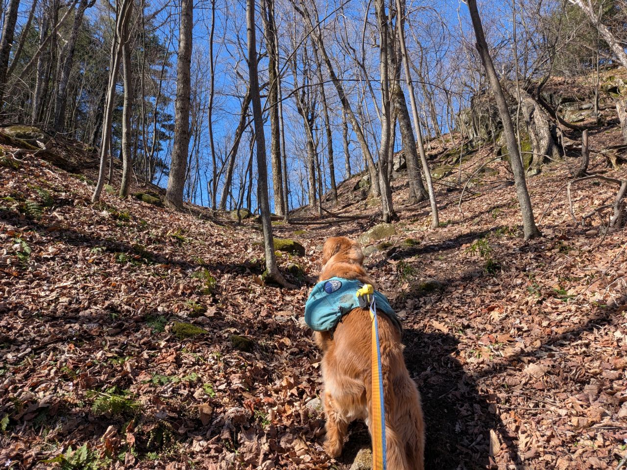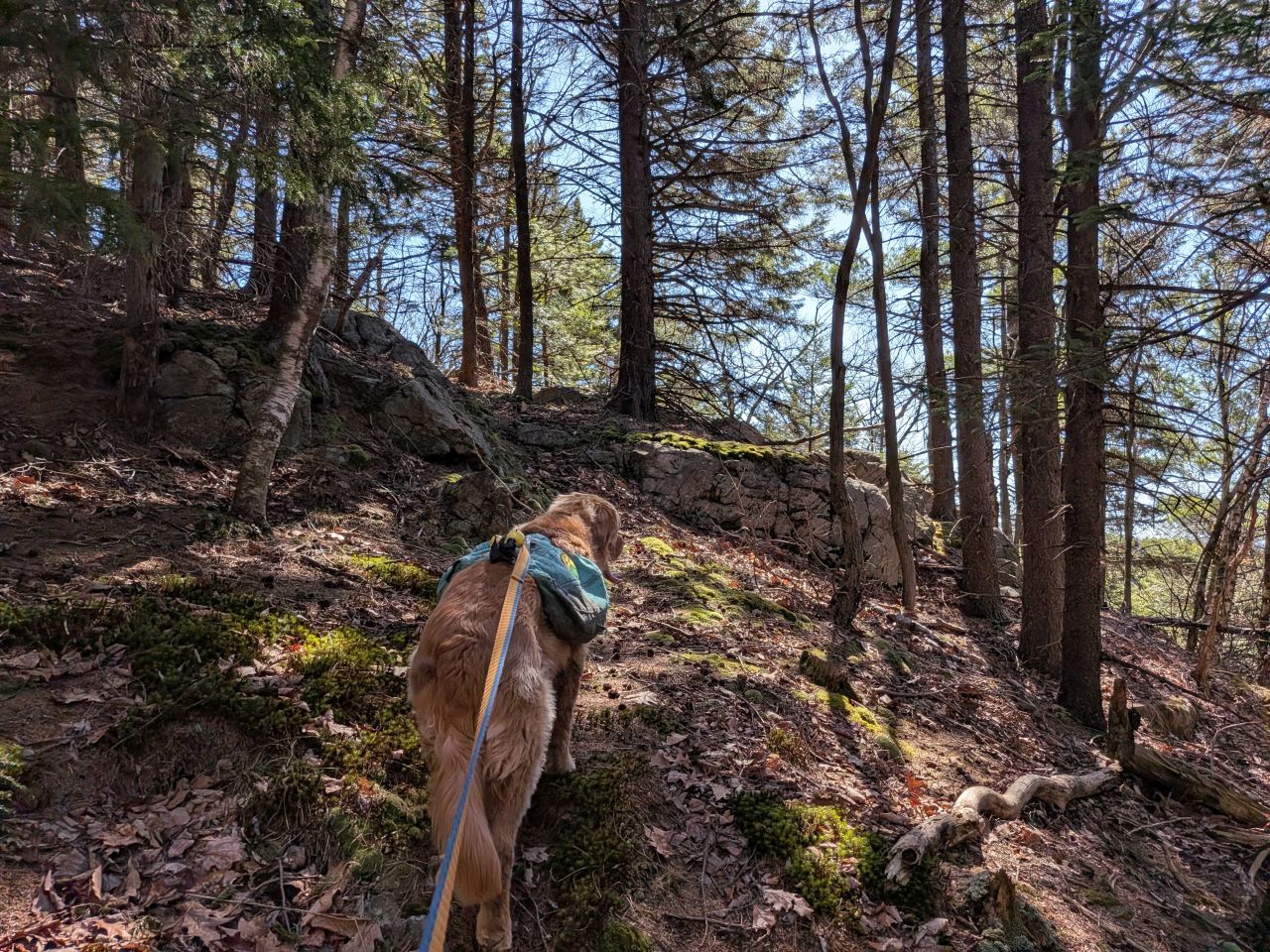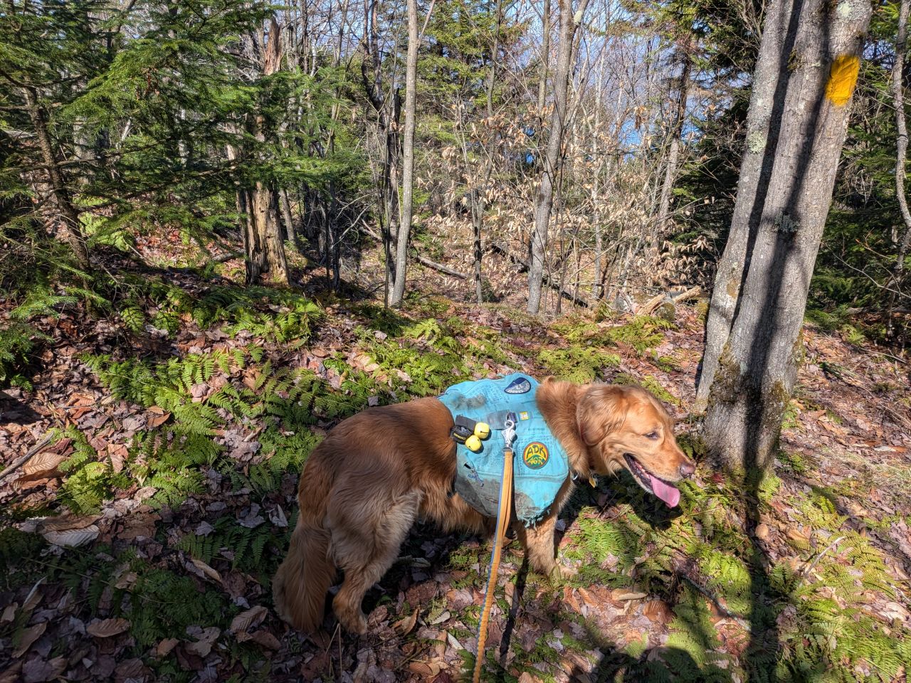 The sights along the way were pretty standard Lake George fare. Rocky streams cut across our path a few times which Sunny took advantage of. Rocky outcroppings slashed across the landscape past the trees on both sides. Although the deciduous trees had not yet decided to bloom much, the birds were singing (especially Jays). Hard-working woodpeckers were a constant companion today.