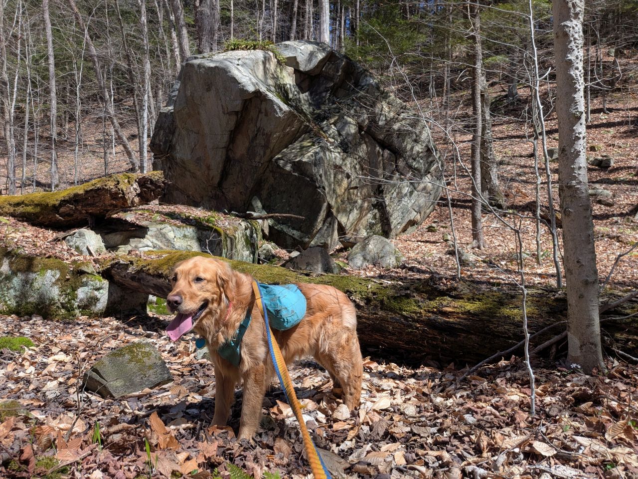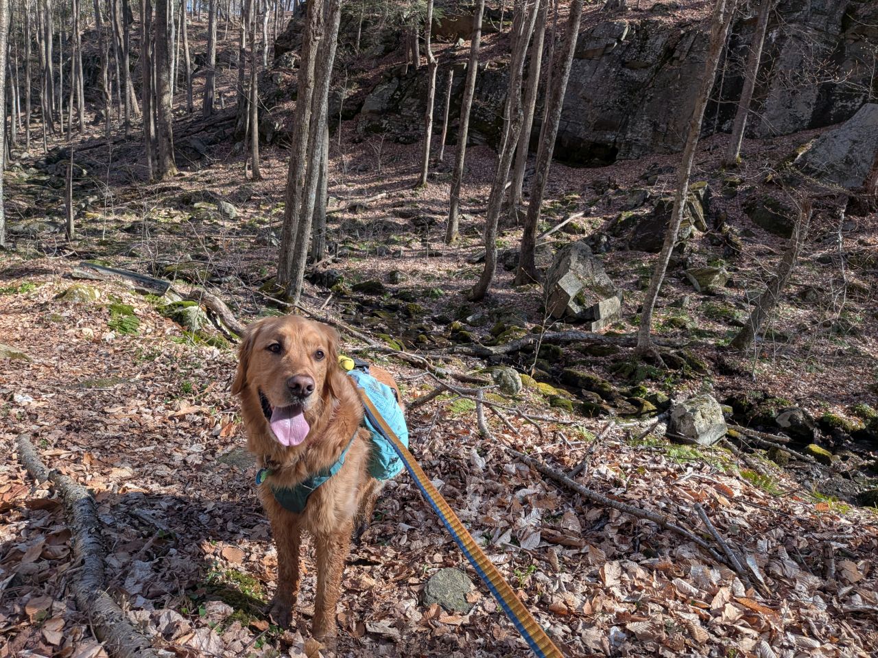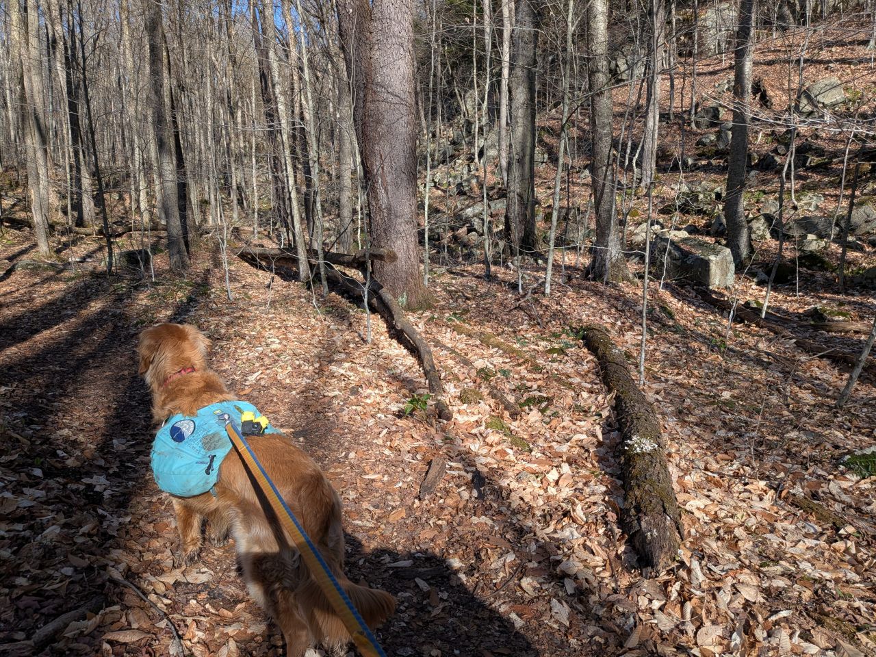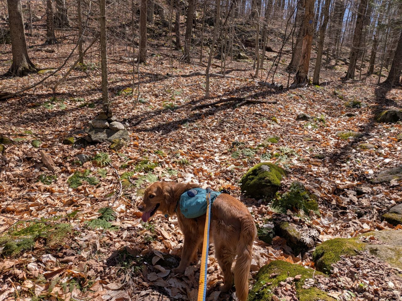The sights along the way were pretty standard Lake George fare. Rocky streams cut across our path a few times which Sunny took advantage of. Rocky outcroppings slashed across the landscape past the trees on both sides. Although the deciduous trees had not yet decided to bloom much, the birds were singing (especially Jays). Hard-working woodpeckers were a constant companion today.