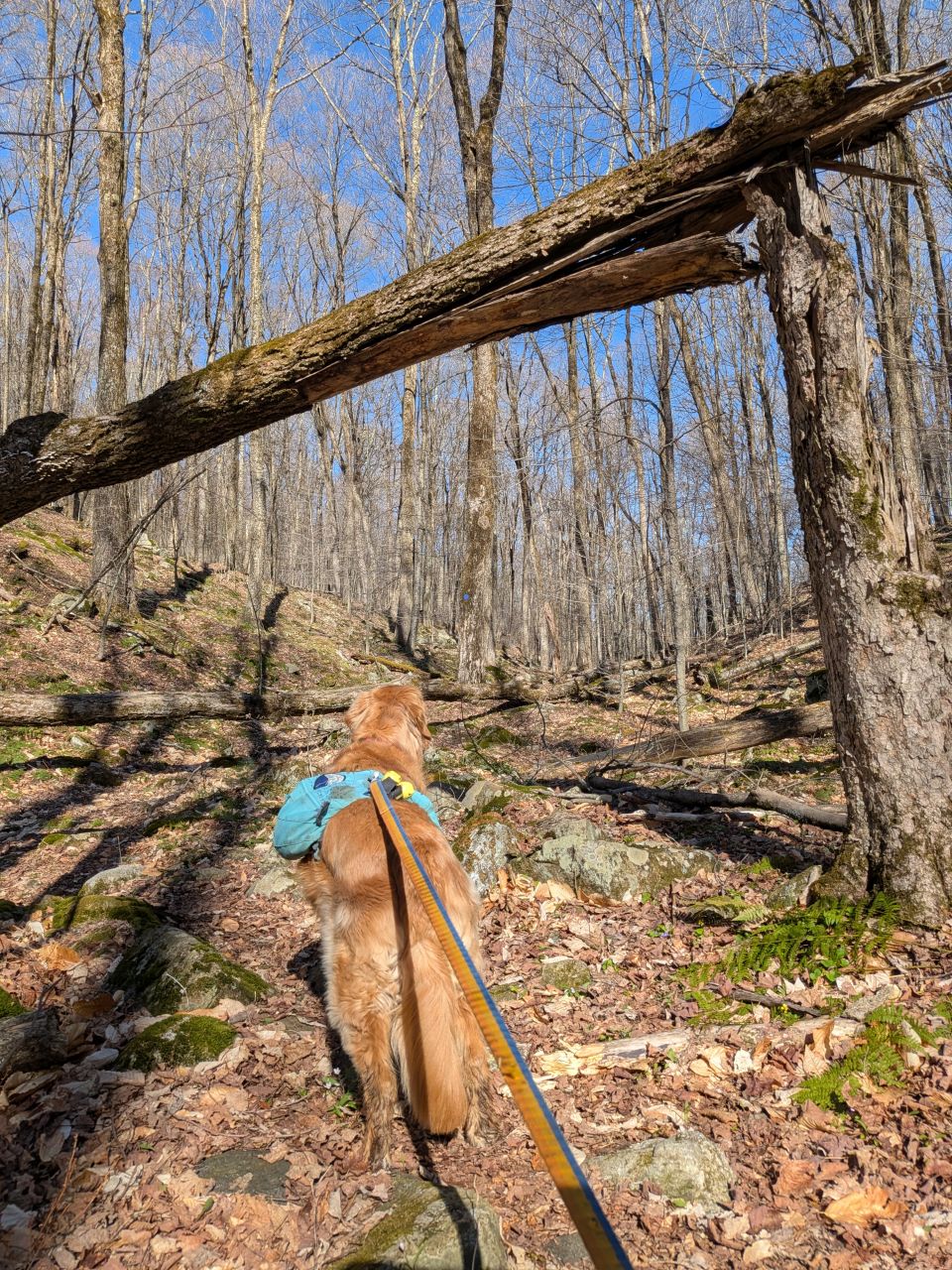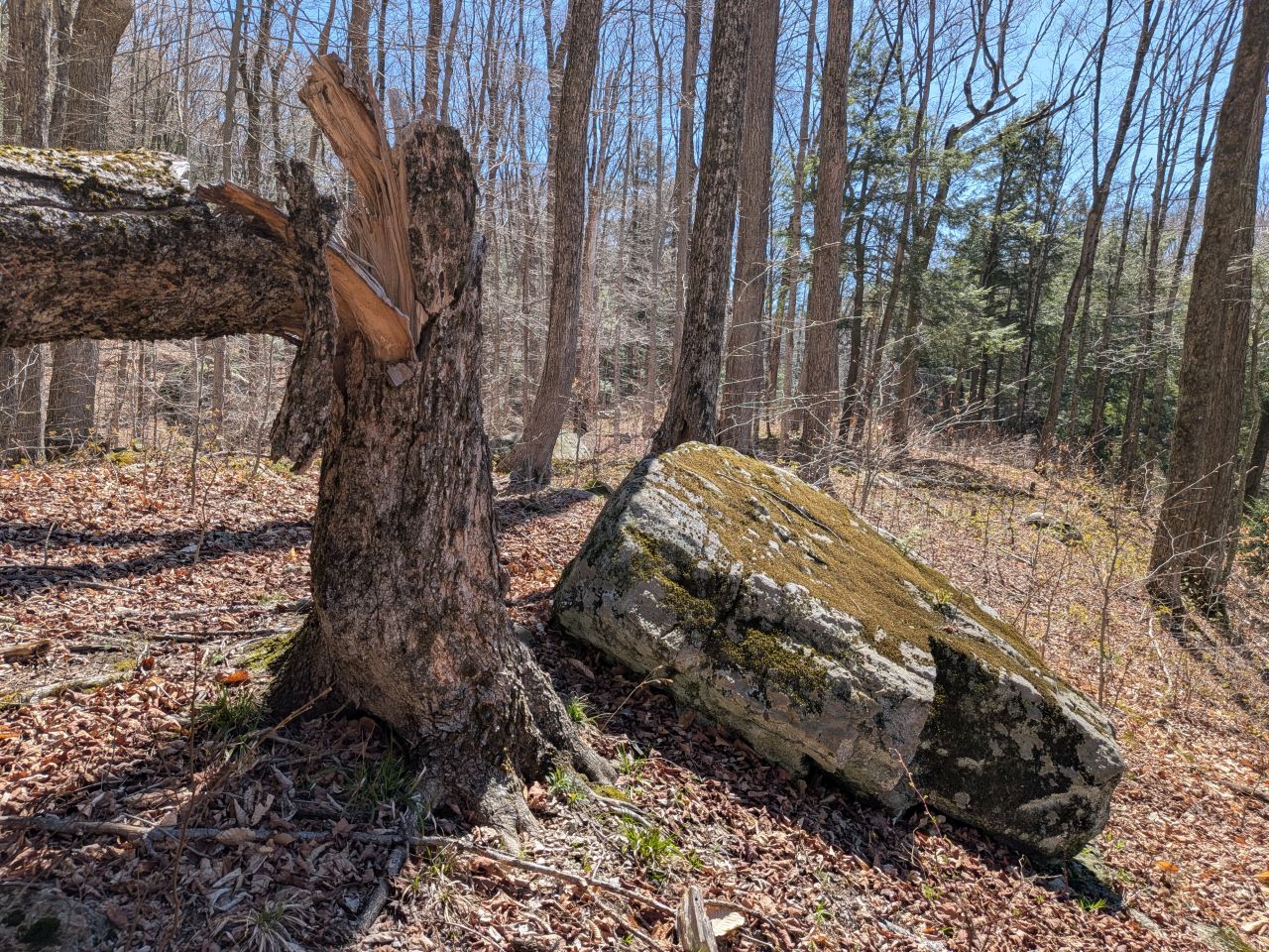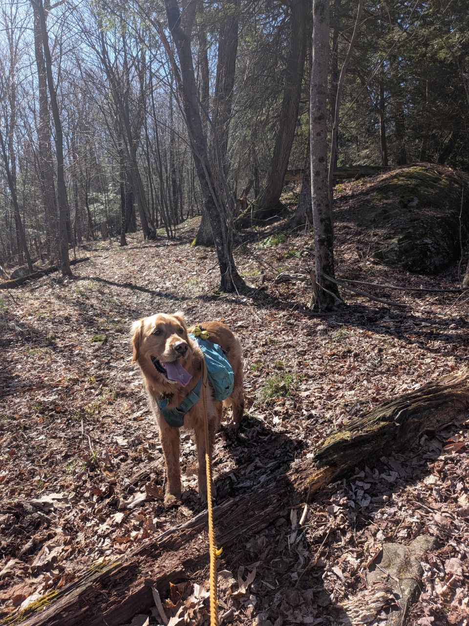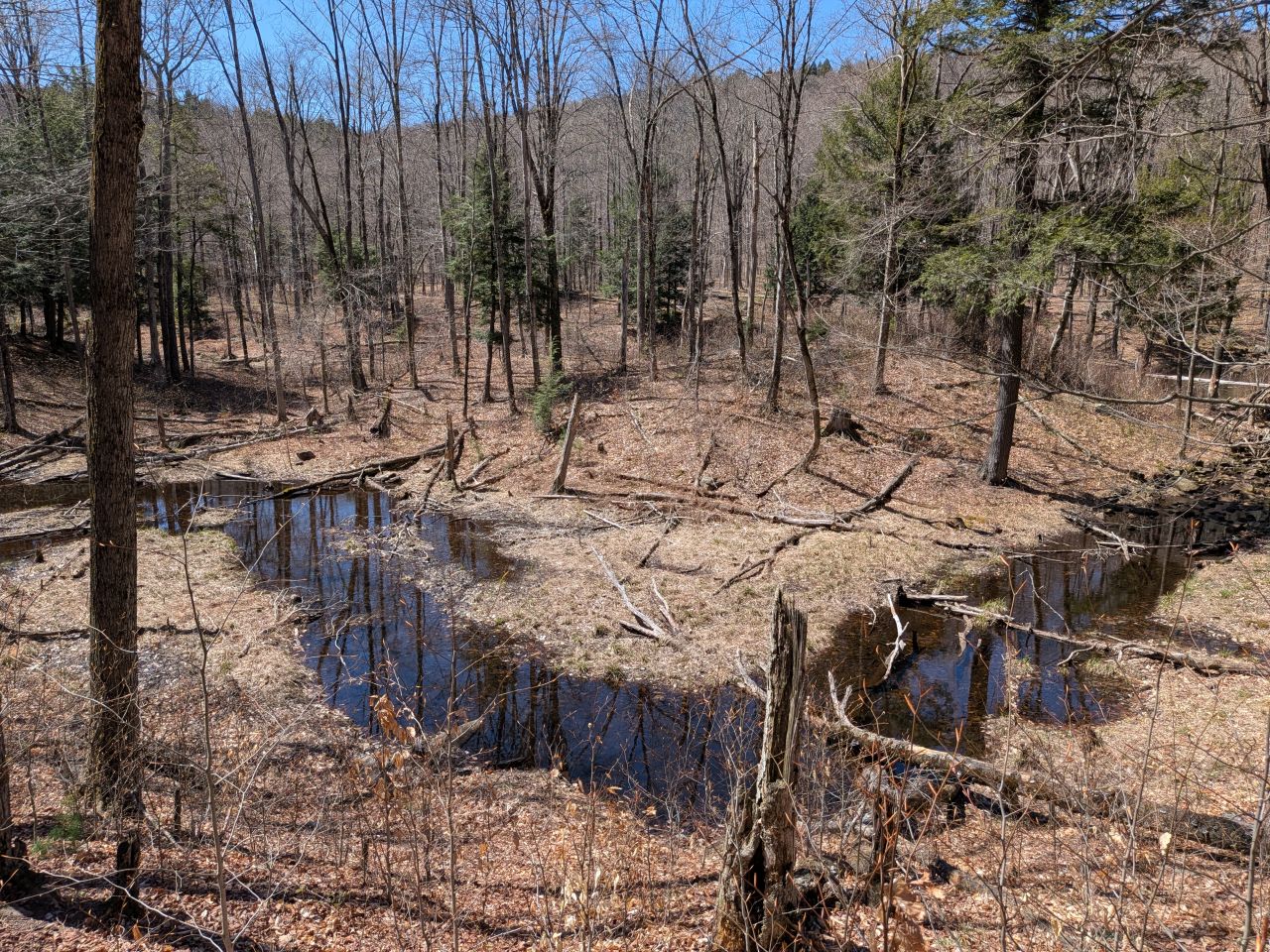 The sights along the way were pretty standard Lake George fare. Rocky streams cut across our path a few times which Sunny took advantage of. Rocky outcroppings slashed across the landscape past the trees on both sides. Although the deciduous trees had not yet decided to bloom much, the birds were singing (especially Jays). Hard-working woodpeckers were a constant companion today.
