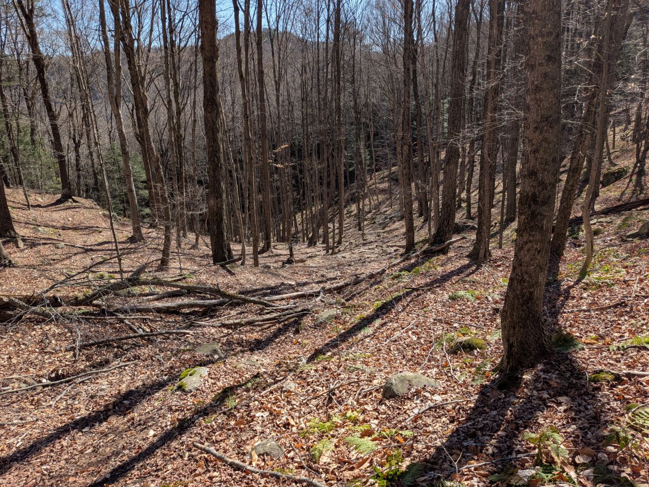 We did follow the yellow-marked trail for a little bit, but we were losing elevation fast and I wanted to make a decision about our bonus objectives. I wanted to make sure I was home in time for Quinn, after all. I decided we'd skip the views from the ridge for now and make a bee-line for the climbers' path junction which, I calculated, would save us hundreds of feet of elevation re-gain. We made a hard right and started bushwhacking down the slope.