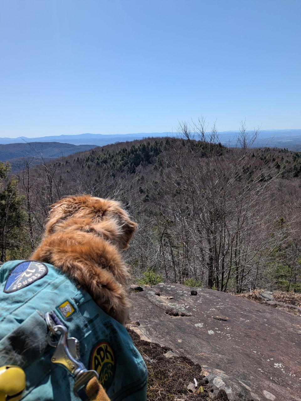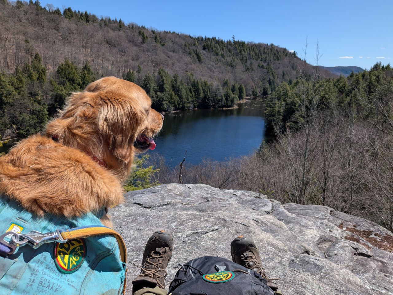 The overlook is situated on a huge, glacially-tortured rock formation. The view is quite beautiful. I'll be back here again I'm sure. After having lunch, we were packing up when our first hiker of the day approached us. Sunny was very happy to finally get some pets from a stranger, after which we left her to her solitude.