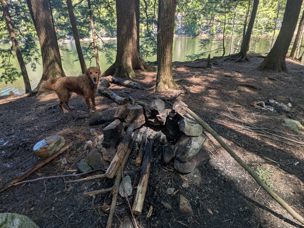 Sunny doesn't care about the differences between gneiss and limestone. Bro just wants to hike and swim. Sunny had an incredible time swimming for sticks (as usual). I'm not sure I'd want to swim in the pond, but the water was rather clear at the shore near the campsite.