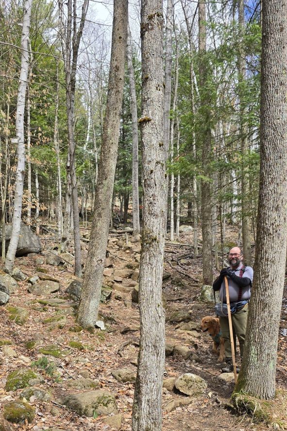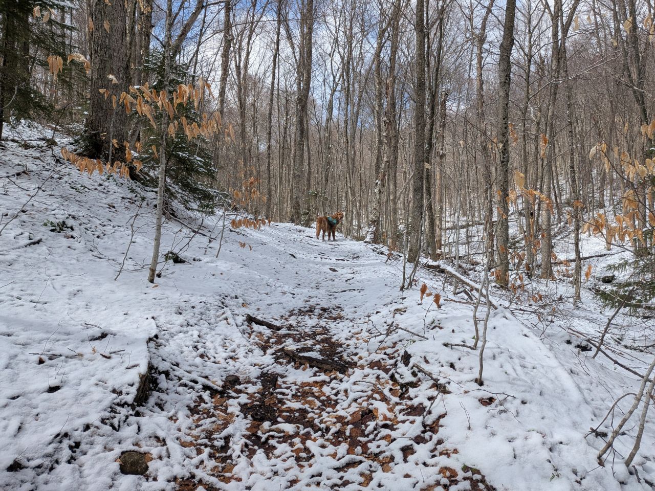 After an initial elevation gain of 350' up the side of the mountain, the the trail hooks a hard right and starts up the long Western spur. Here, at least in Brown Season, you can see the summit looming between the trees.
