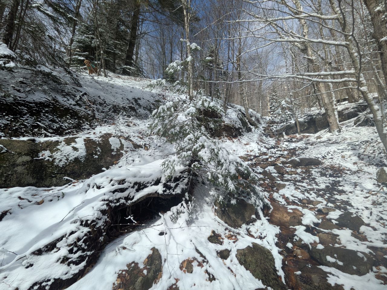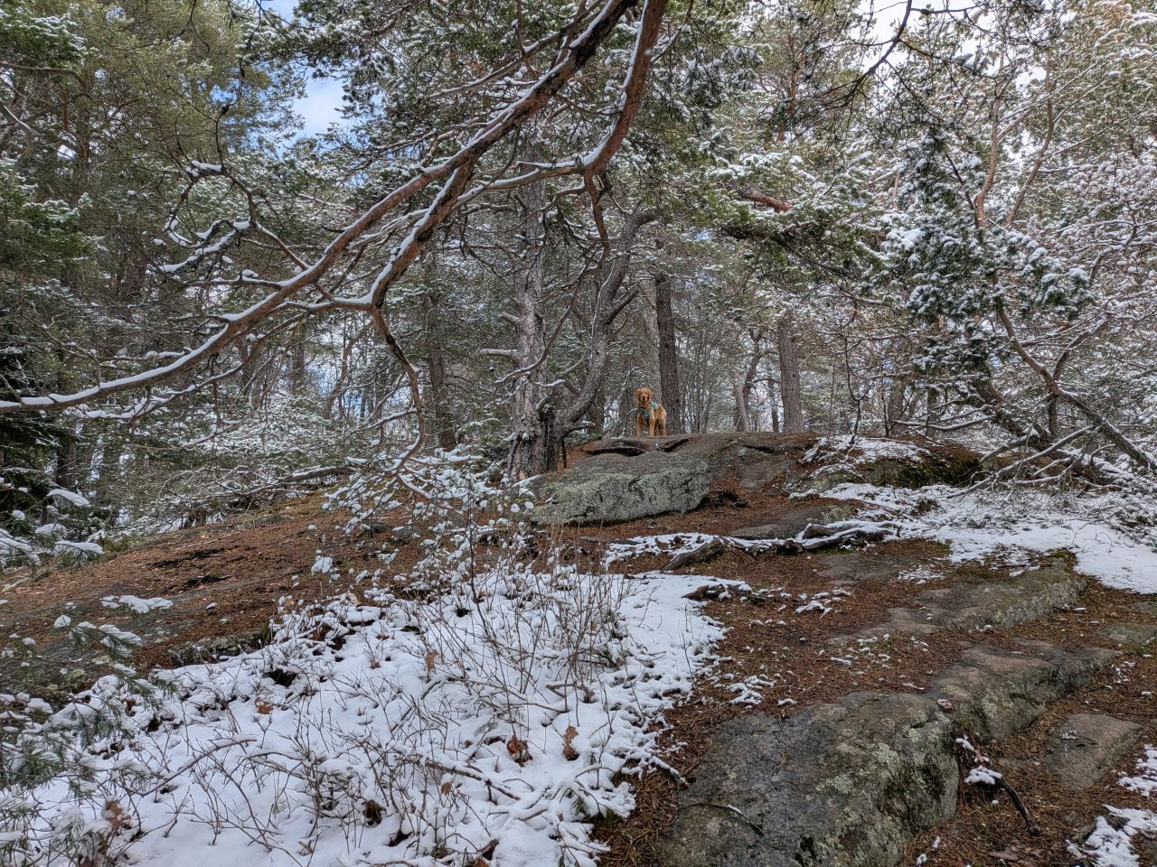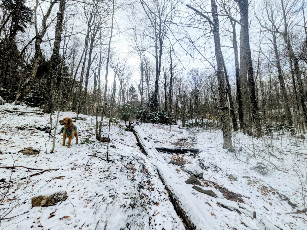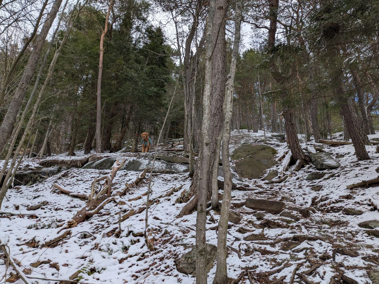 The terrain does a bit of up and down over the first lump of elevation. We saw no footprints in the snow despite there being a couple of cars in the lot. We figured those folks might have taken one of the other trails or were paddling rather than hiking. Dan suggested it might be okay to cut Sunny loose and I agreed. He was quite happy about this and frolicked merrily.