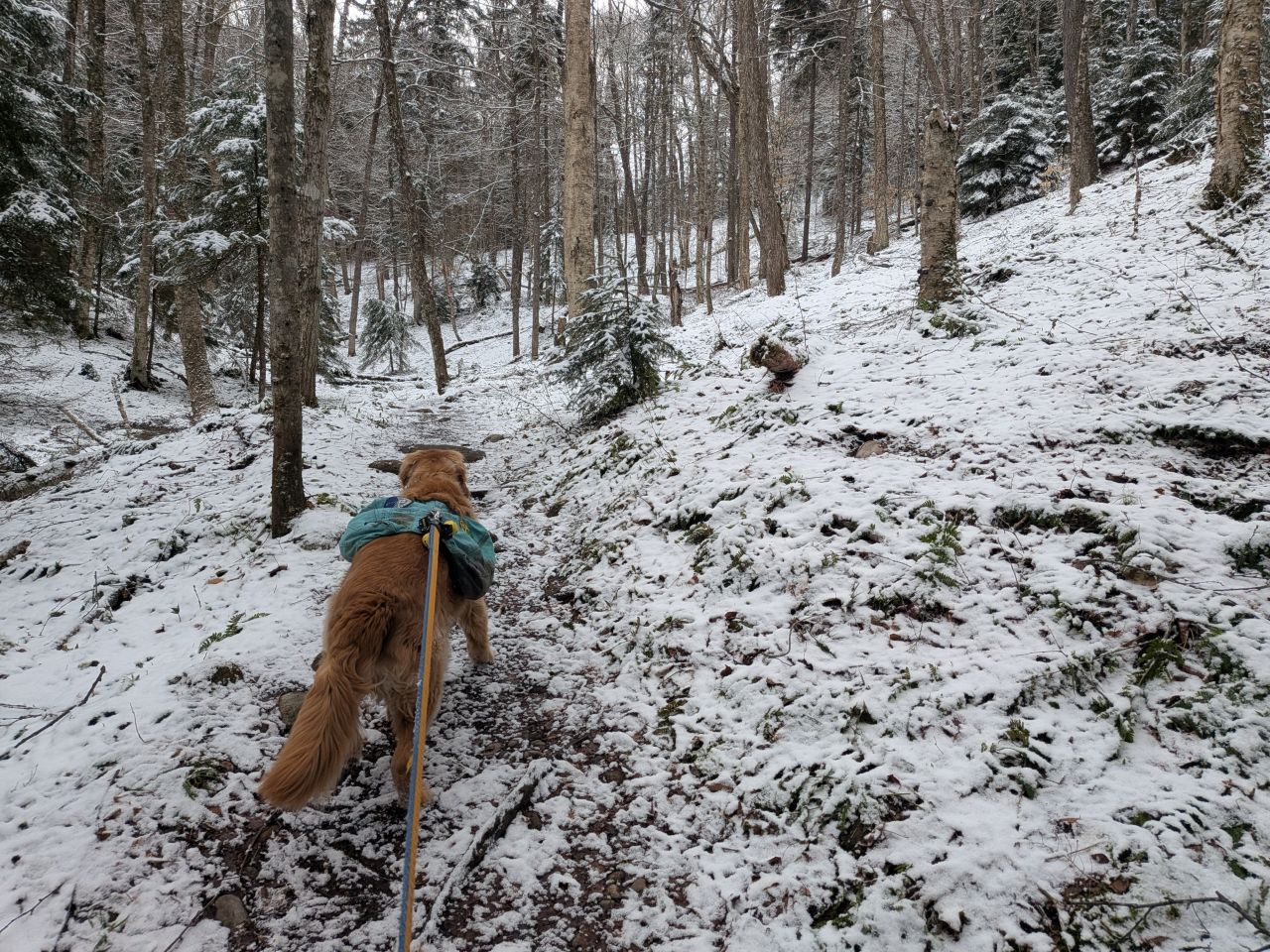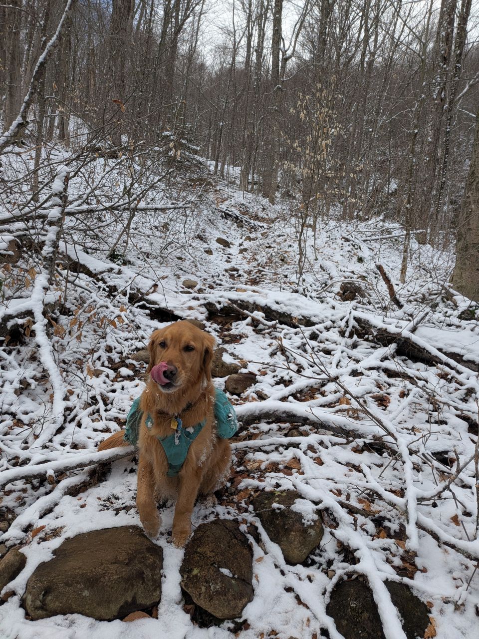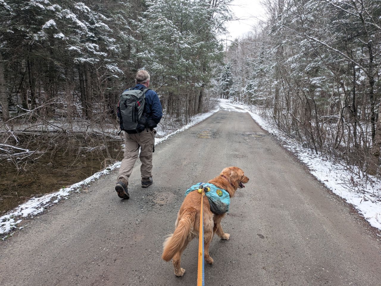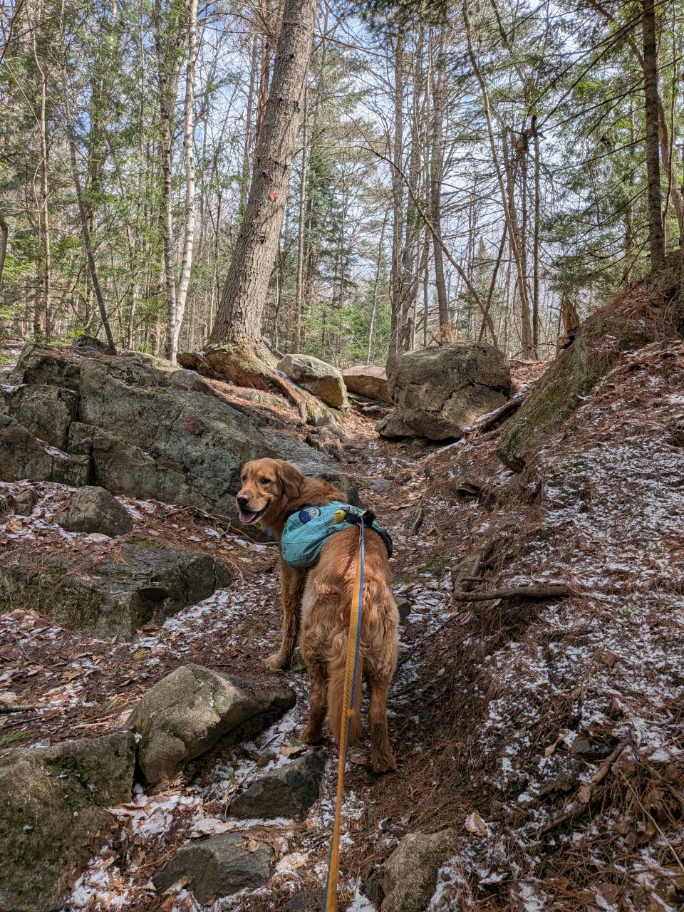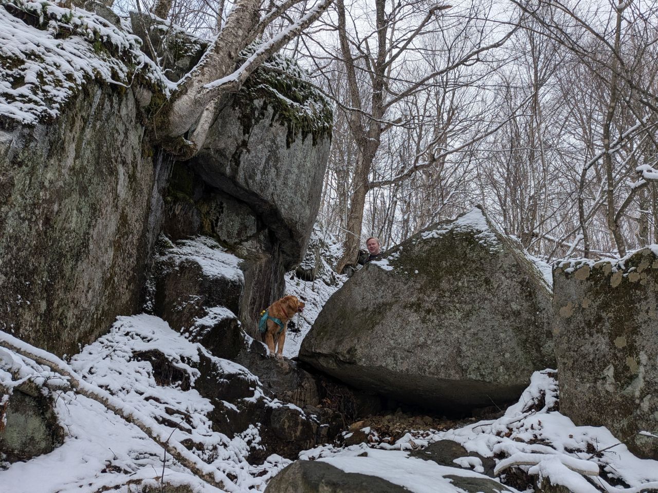 The terrain does a bit of up and down over the first lump of elevation. We saw no footprints in the snow despite there being a couple of cars in the lot. We figured those folks might have taken one of the other trails or were paddling rather than hiking. Dan suggested it might be okay to cut Sunny loose and I agreed. He was quite happy about this and frolicked merrily.