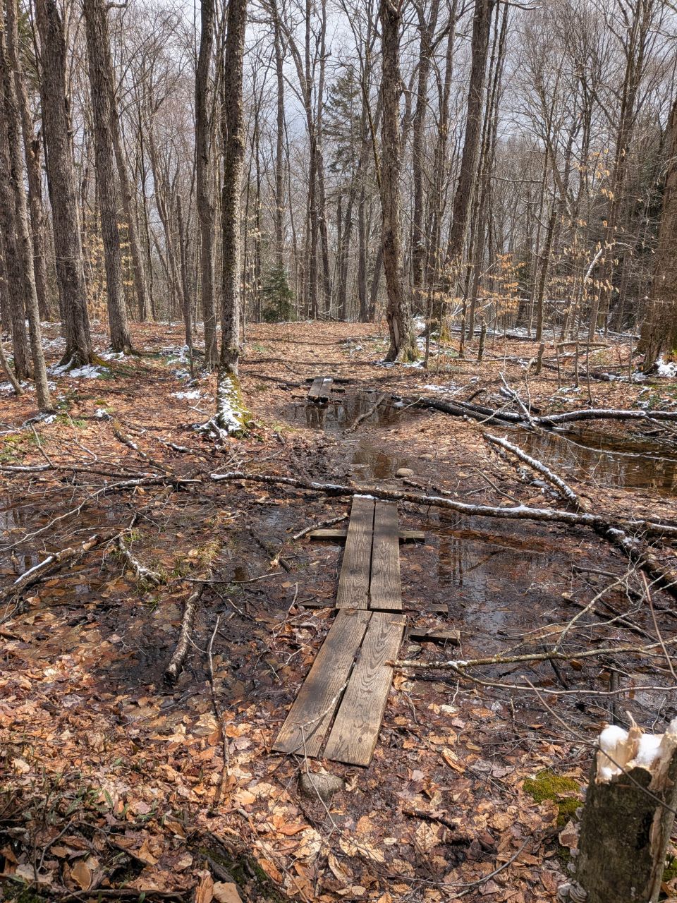 After a mile of steady ascent, we descended for half a mile to the bottom of the hill, having lost all but 50' of the elevation we'd gained. There was a short, flat section before the trail started climbing again. These lower elevations had a bit of mud, but nothing really to complain about. I think there were two large puddles on the trail, one with boardwalks and one without.