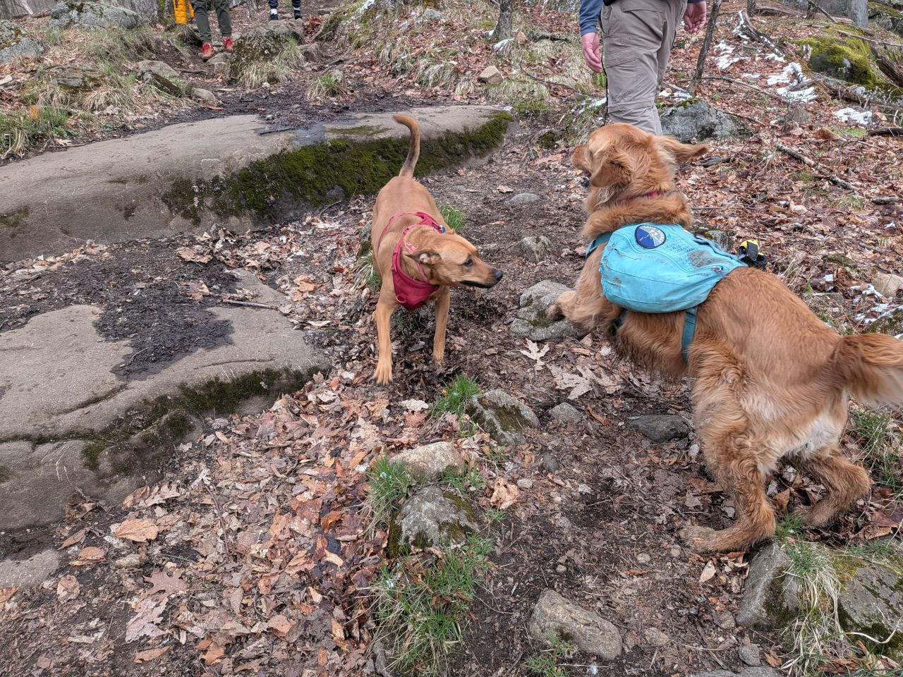 We ate our sandwiches and enjoyed the fire tower. It's always much easier to enjoy a fire tower with a friend there because someone can calm down Sunny while I climb it. The tower on Saint Regis isn't very tall, likely because it doesn't need to be in order to peek over the few trees up there. There's only stairs; no ladder.