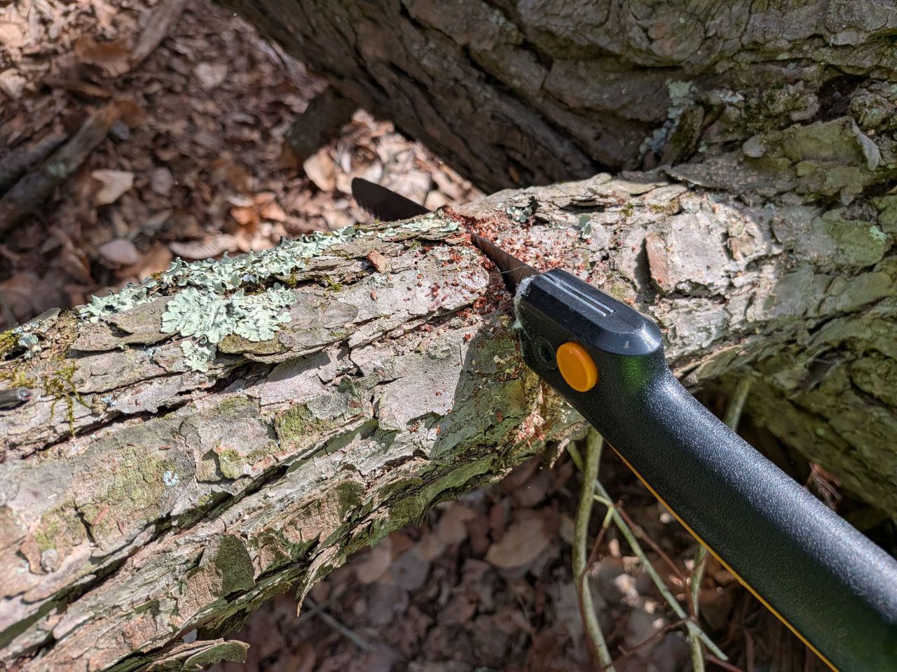 We also got a lesson in chopping thicker trunks with axes, what angles to use and other techniques. This was especially helpful because I've never chopped a tree in my life. Motorized tools of any kind are not allowed; these tools require special certification and even the rangers can't use them except during certain windows on the calendar. However, one of the volunteers did have a device called a "pocket chainsaw" which was fascinating. It's simply two handles with a long, flexible chainsaw-like blade strung between them. It worked a treat.