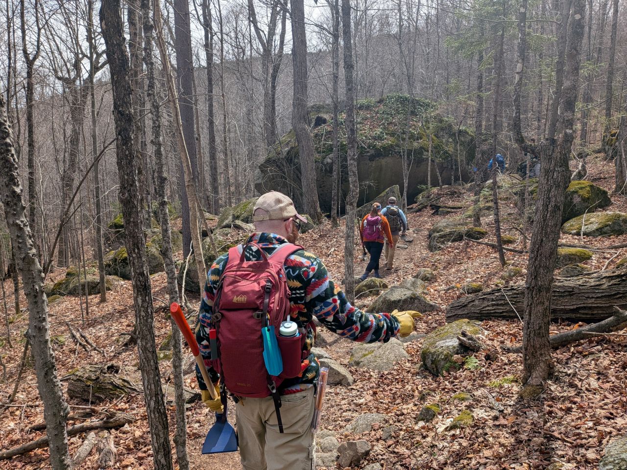 I loaded up the car with my backpacking tools and a common garden hoe, then drove to the Rooster Comb trailhead. I didn't get a head count, but I think there were like a dozen people there. Our trainer said there were upwards of 200 adopters overall.