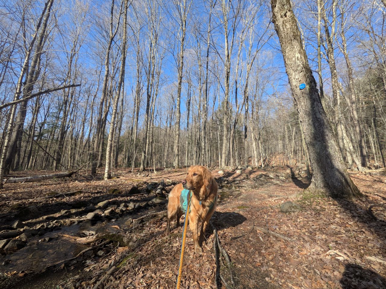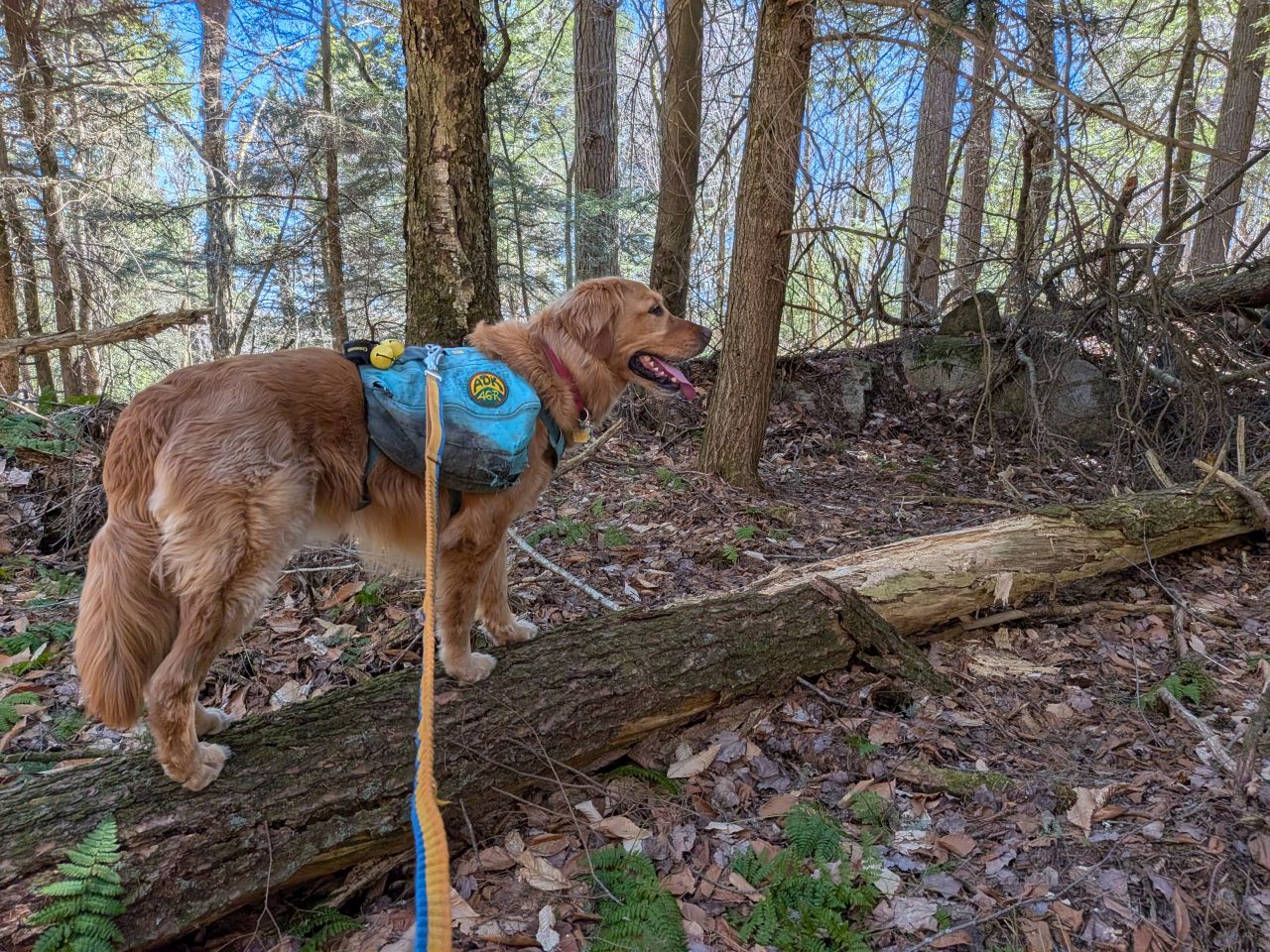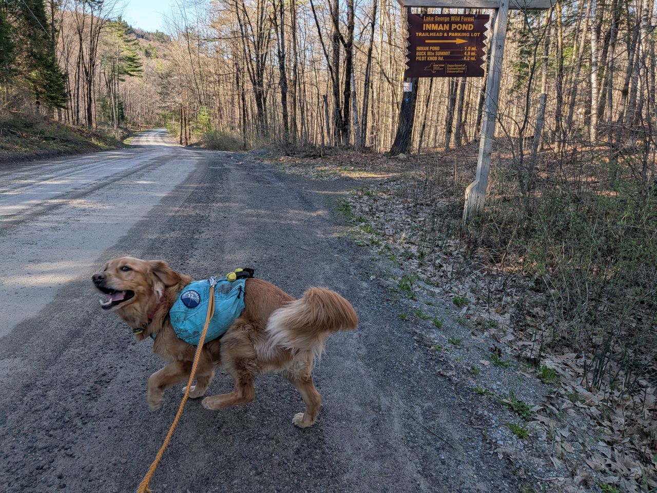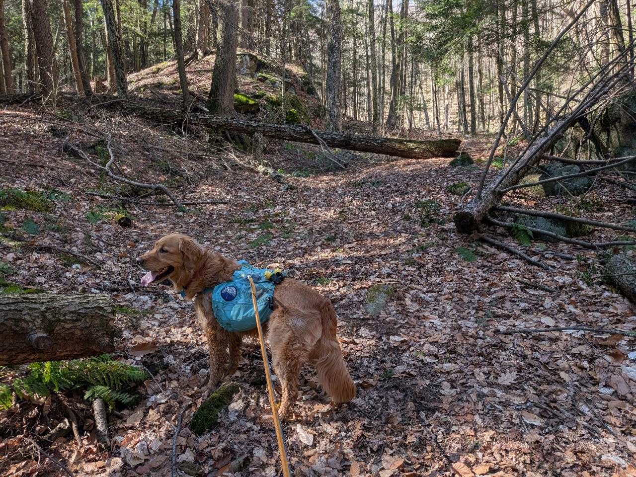 The sights along the way were pretty standard Lake George fare. Rocky streams cut across our path a few times which Sunny took advantage of. Rocky outcroppings slashed across the landscape past the trees on both sides. Although the deciduous trees had not yet decided to bloom much, the birds were singing (especially Jays). Hard-working woodpeckers were a constant companion today.