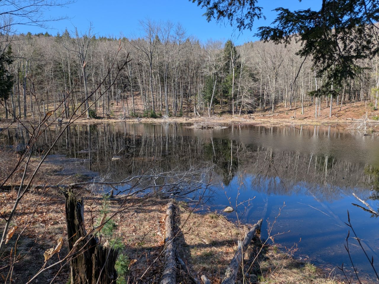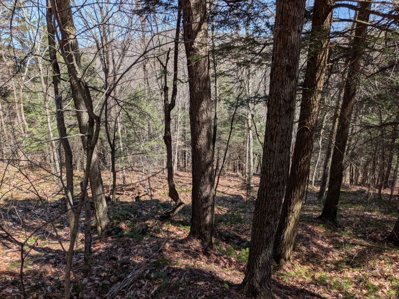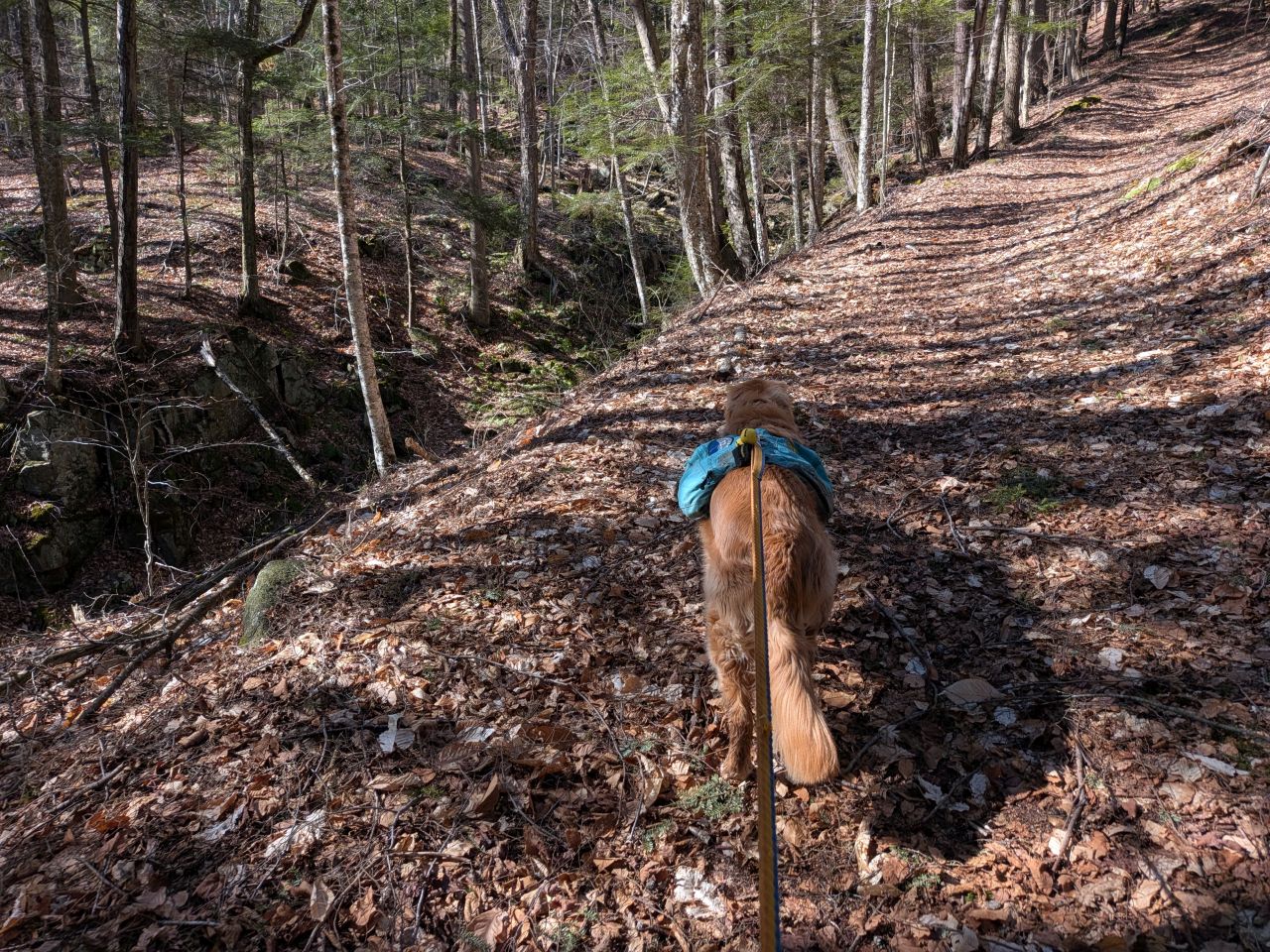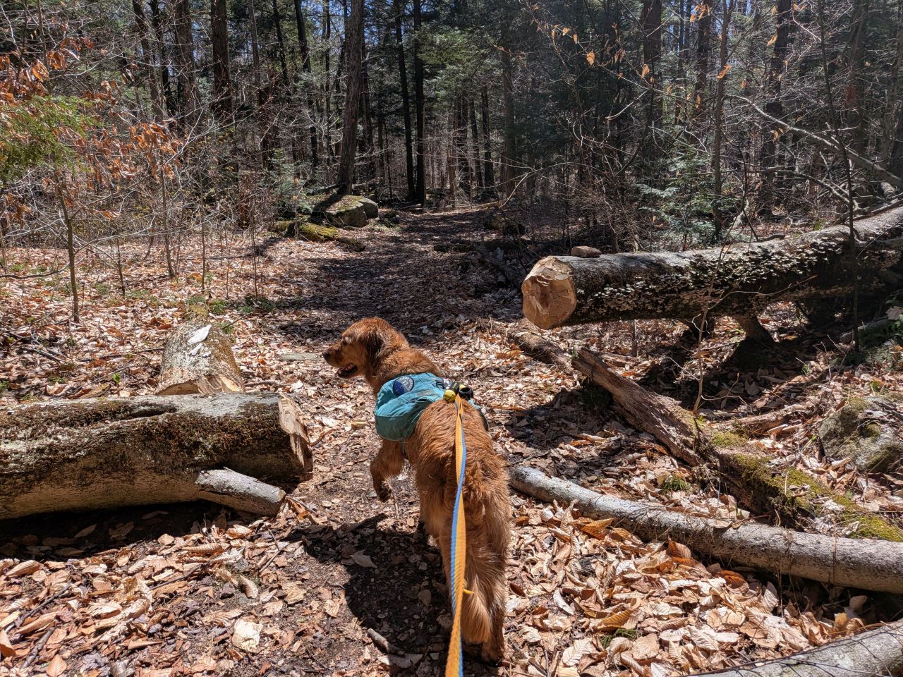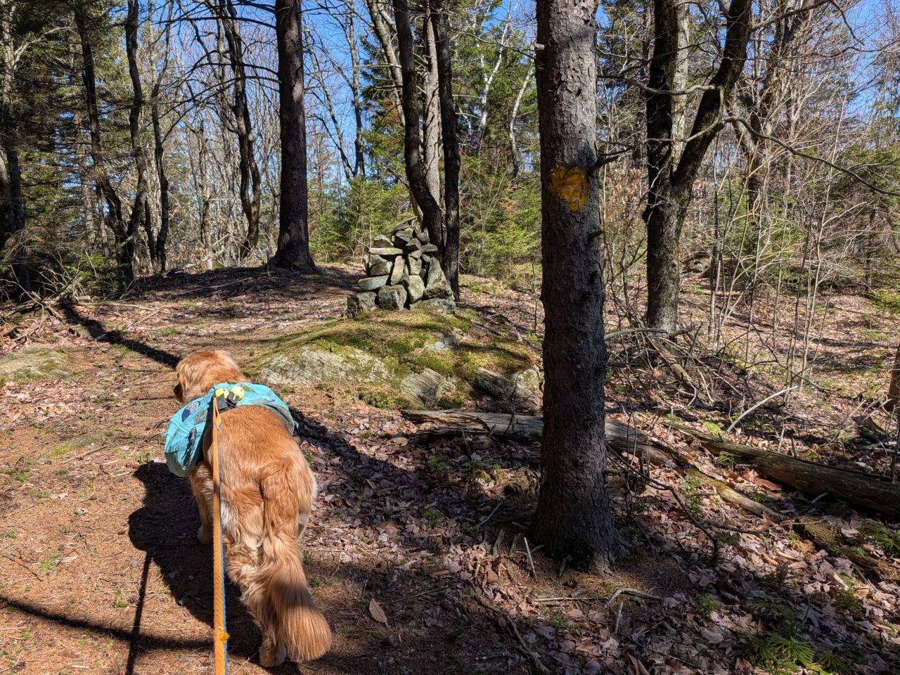 The sights along the way were pretty standard Lake George fare. Rocky streams cut across our path a few times which Sunny took advantage of. Rocky outcroppings slashed across the landscape past the trees on both sides. Although the deciduous trees had not yet decided to bloom much, the birds were singing (especially Jays). Hard-working woodpeckers were a constant companion today.
