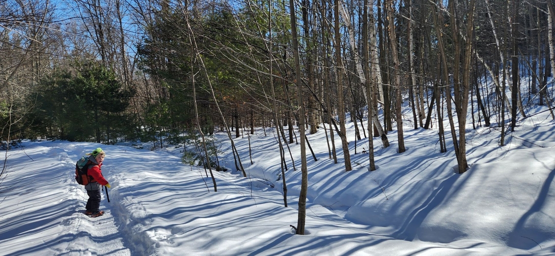 Our microspikes did get a workout since the trail was a hard-packed superhighway of snow and ice from start to finish. We moved pretty fast, though, even with an almost-5-year-old who wanted to explore and play the whole way. We passed the time spotting trail markers and playing games like "favorite things".